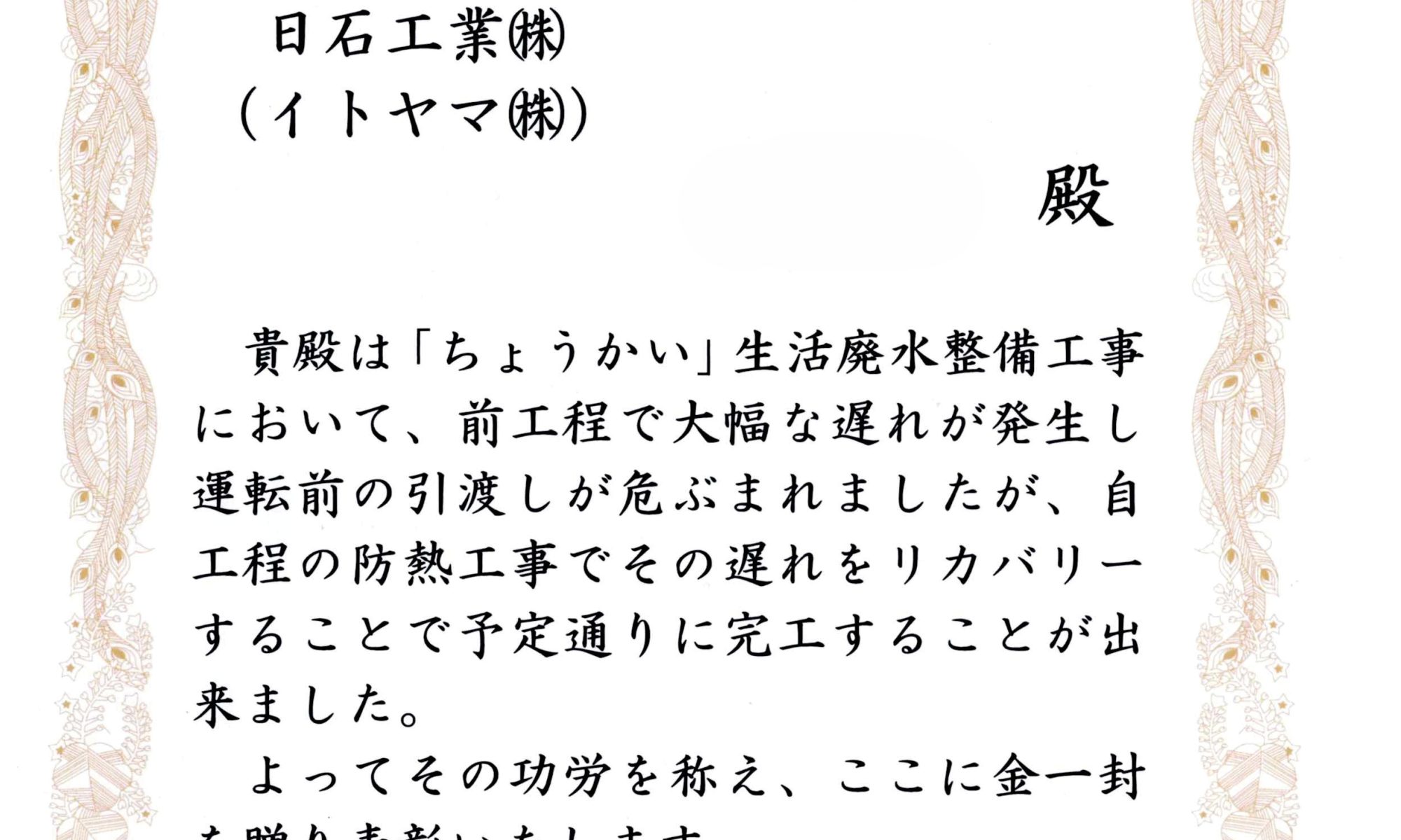前工程での大幅な遅れに対するリカバリー活動を評価頂き、現場対応に当たった弊社の社員及び下請け協力会社殿へお客様よりお礼の言葉と感謝状を頂いております。